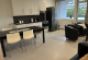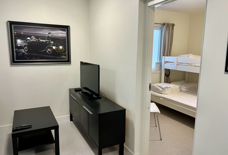 Liten leilighet med stue/kjøkken-løsning, toalett, et soverom med «familieseng» og dyner/puter, TV og internett.