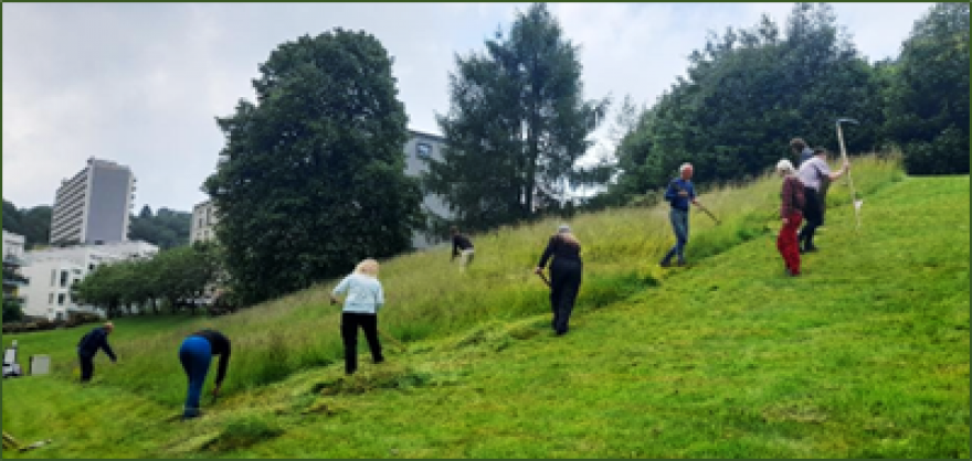 Tusen takk til alle som bidro for å gjennomføre slåttonn på Smiebakken. Vi var 22 stykker som diskuterte blomsterenger, fikk slå med ljå og hesje.